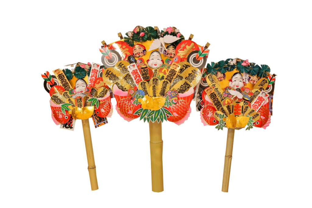縁起物の熊手は華やかな装飾が特徴で、恵比須・大黒天・おかめ・鶴亀・小判などの飾りなどが付けられます。熊手は商売繁盛を願う方をはじめ、ご家庭でも家内安全や開運招福などの福運を「かきこむ」縁起物としてお受けになる方が多くなっています。